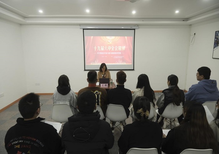 西密歇根学院 蒋舒阳 图文报道)11月18日下午,西密歇根学院党委副书记王瑛在西密歇根学院学生宿舍四栋一楼会议室为团委老师及团委各部门的学生上了一堂关于学习“十九届六中全会精神”的微团课。