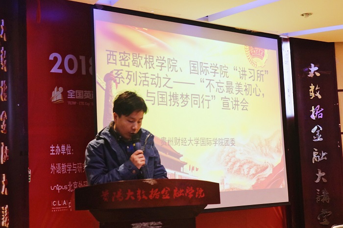 王馨宇、高菁菁、谢肇婕、吴汝昕四位同学分别从“团的十八大精神”、“全国教育大会精神与学校第二届党代会精神”、“全省教育大会精神”、“习近平新时代中国特色社会主义思想”四个方面,围绕“不忘初心、牢记使命”进行宣讲。他们结合自己的学习、生活实际,对“不忘初心、牢记使命”进行了深入浅出的讲解,强调了新时代的我们需要承担的责任与义务,中国未来发展需要新时代的我们去继承和发扬。