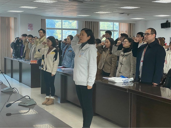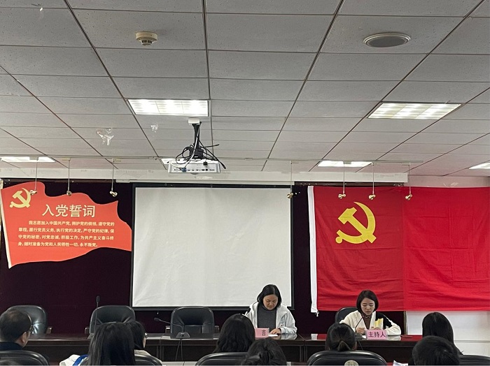 仪式开始,全体起立奏唱国歌。在潘吉的领誓下,党员们面对鲜红的党旗,右手举拳,庄严宣誓。潘吉代表学院党委对新党员表示祝贺,并对新党员提出了四点期望:第一,要加强党的理论知识学习,在学习中领略党的新的历史任务;第二,要加强党性修养,提高自身素质,在思想政治上与党中央保持高度一致;第三,要自觉以党员标准严格要求自己,时时刻刻发挥好模范带头作用;第四,要发挥党员的先进性,努力成为一名有理想有抱负的优秀共产党员。
