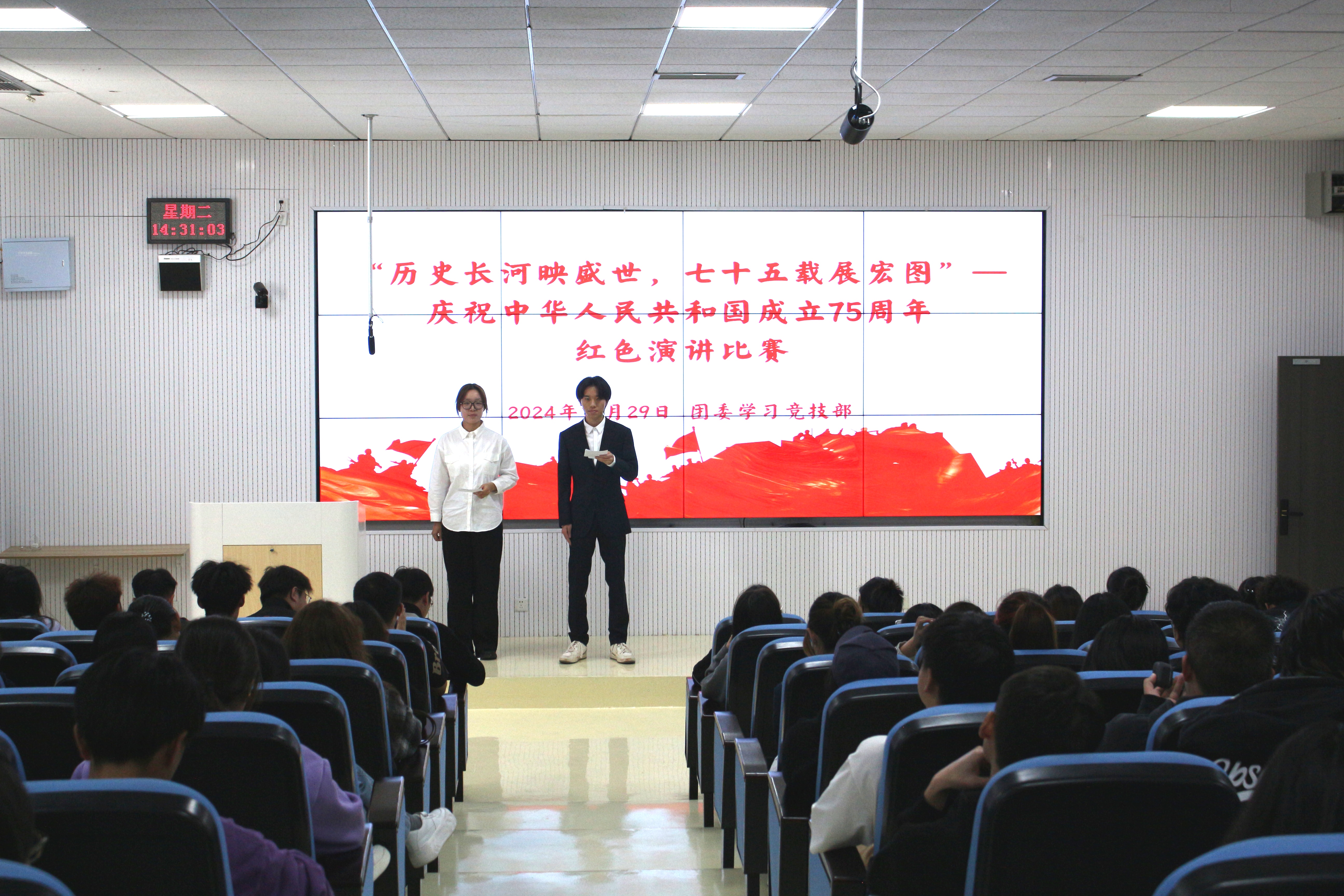 在乐学楼101教室举办“历史长河映盛世,七十五载展宏图”——庆祝中华人民共和国成立75周年红色演讲比赛。