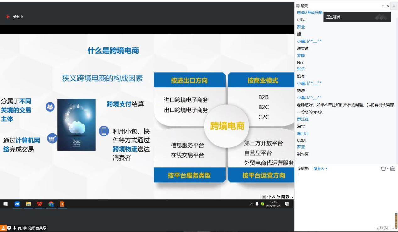 莫川川通过校企合作模式分析介绍了电子商务专业的发展现状,着重在专业人才培养模式方面进行了讲解。同时,以广州番禺职业技术学院与阿里巴巴校内实践实况作为案例分享,引入了跨境电商发展现状的分析,分析中以跨境电商的参与主体、跨境电商服务商生态和跨境电商发展历程等几方面做出了详细讲解。其次,莫川川通过跨境电商三部曲:曝光、点击和成交(ECO)展开跨境电商主流平台运营特点的分析。分析过程中主要以电商思维之“黄金三要素”和5大营运节点进行讲解,并且以亚马逊为例让参与讲座的人员实际参与到相关问题的思考中。最后,莫川川以跨境电商运营前景分析和TikTok Shop简介结束了此次讲座。讲座过程中,莫川川、罗亚和参与此次讲座的师生进行了良好的互动,大家纷纷就自己对电子商务的疑问进行沟通交流,讲座气氛融洽,学术氛围浓厚。
