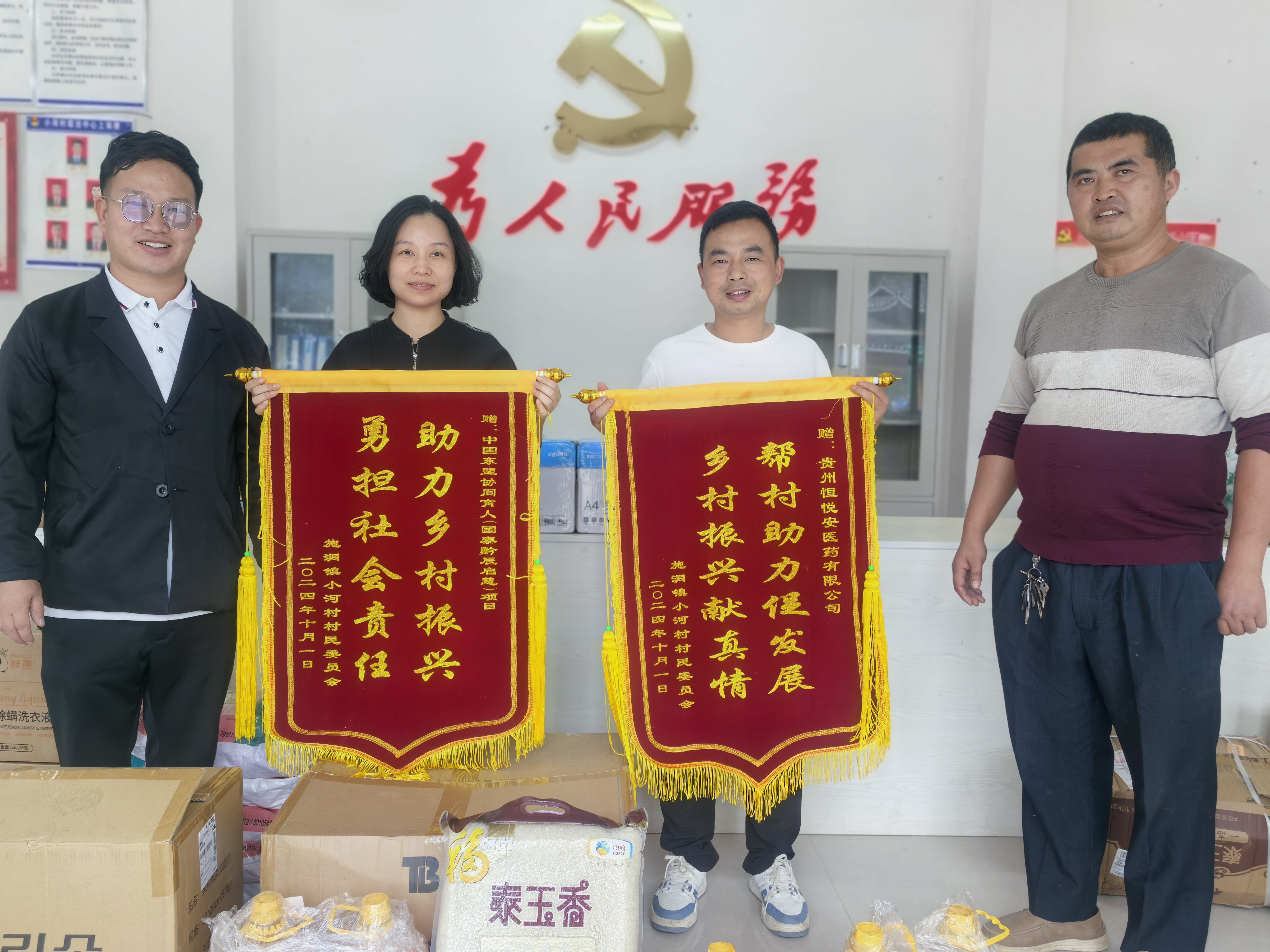、贵州恒悦安医药有限公司和中国东盟协同育人项目共同捐赠的价值6000余元物资由古鸿宇、杨昌勇、周黔亲手交到小河村支书张黎健手中,张黎健拿出提前准备好的锦旗并代表全体村民对古鸿宇一行的慷慨相助表达了衷心的感谢。他表示,这些物资对于小河村来说,犹如雪中送炭。积分超市物资为我们进一步开展乡村治理解决了当前的燃眉之急;保健钙片我会第一时间分发给留守儿童和老党员,让他们感受到了学校和社会各界对小河村发展的关注和支持。物资交接仪式后,张黎健带领古鸿宇一行走访了监测户和困难群众,送去了大米、食用油等,给予龙妹合、刘施英、刘秀英送上慰问金,让他们深刻感受到了来自社会的关爱和温暖。