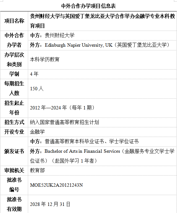 与英国爱丁堡大学合作举办金融学专业本科教育项目获得教育部批准,是贵州省第一个本科层次的中外合作办学项目。2015年,根据《关于通报2015年本科及以上层次中外合作办学评估结果的通知》(教外司办学﹝2015﹞2028号),无码漫画
