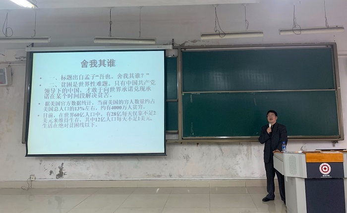 游来林通过案例讲解,向同学们讲述了我国脱贫攻坚取得的历史性的成就指出,扶贫是古今中外治国理政的一件大事,中国脱贫攻坚的伟大胜利,增强了中国人民的“四个自信”。