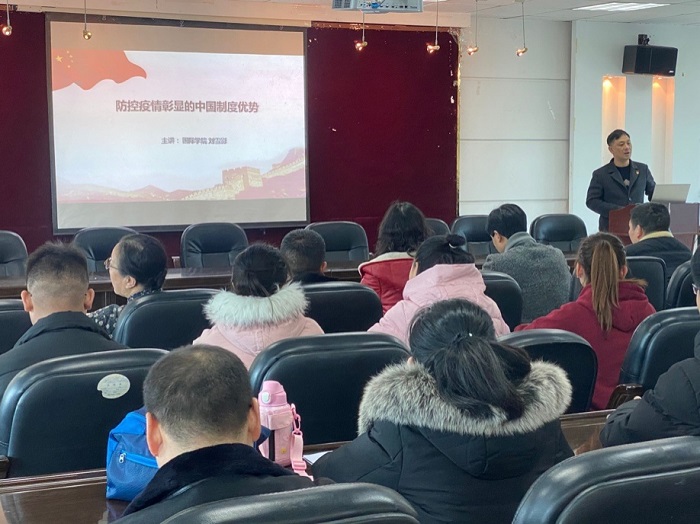 在行政楼六楼会议室开展了主题为“疫情防控彰显中国制度优势”的党员后续教育专题讲座。学院全体师生党员参加讲座,讲座由学院刘雪影博士主讲。