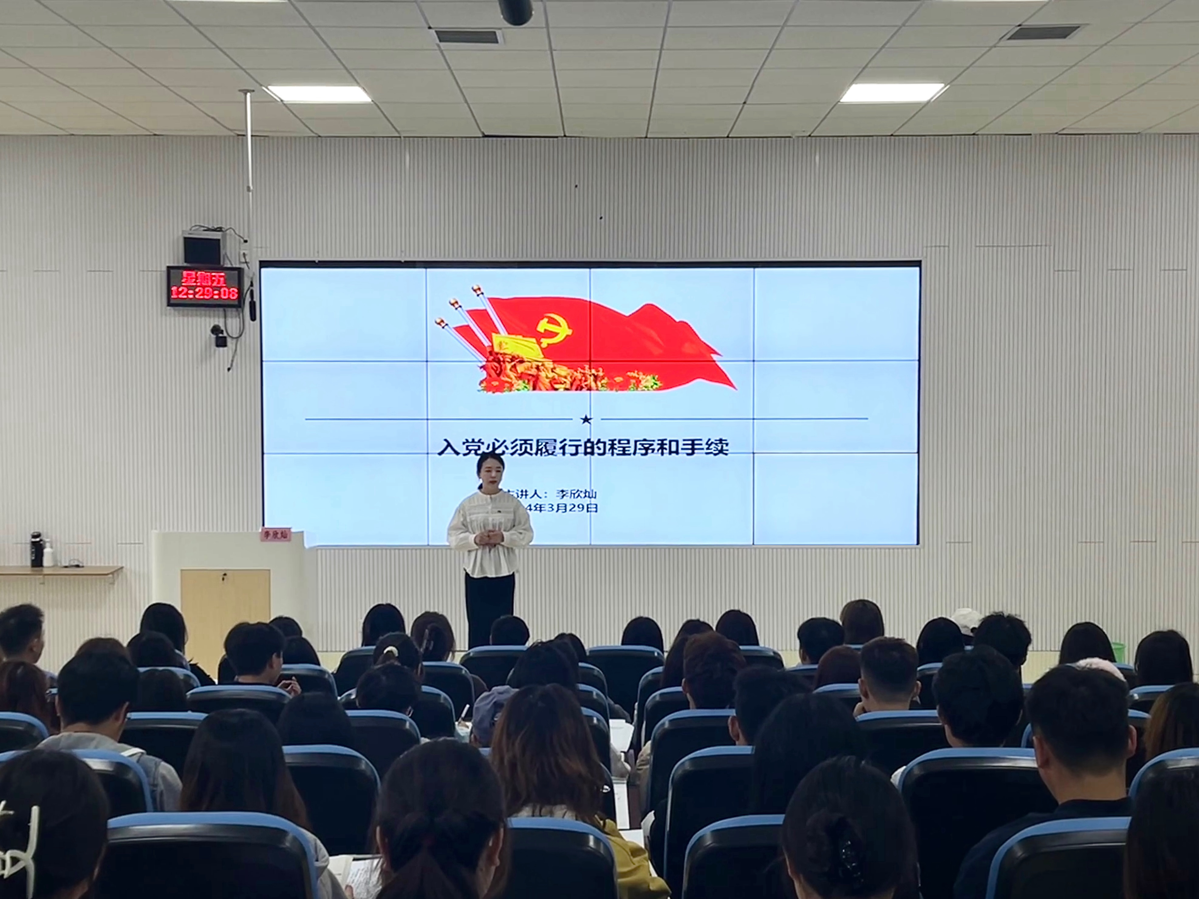 专职组织员李欣灿在乐学楼201教室为2024年春季入党积极分子作《入党必须履行的程序与手续》讲座。