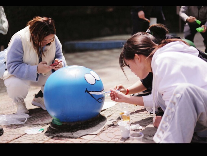 活动分为两个部分,首先是环保标语评选,同学们利用废旧纸板等提前制作好,并带到现场参与评比;第二个部分是现场进行井盖涂鸦,由工作人员带领各队伍在指定区域内设计、喷绘。在涂鸦现场,同学们用手中的工具,绘制出了一幅幅创意十足的作品,为平日里被人忽略的井盖换上了新衣。现场的标语口号,门口的彩绘石墩,都让整个校园都更显生机,也用这种特别的方式,向同学们传播着绿色环保、积极向上的理念。