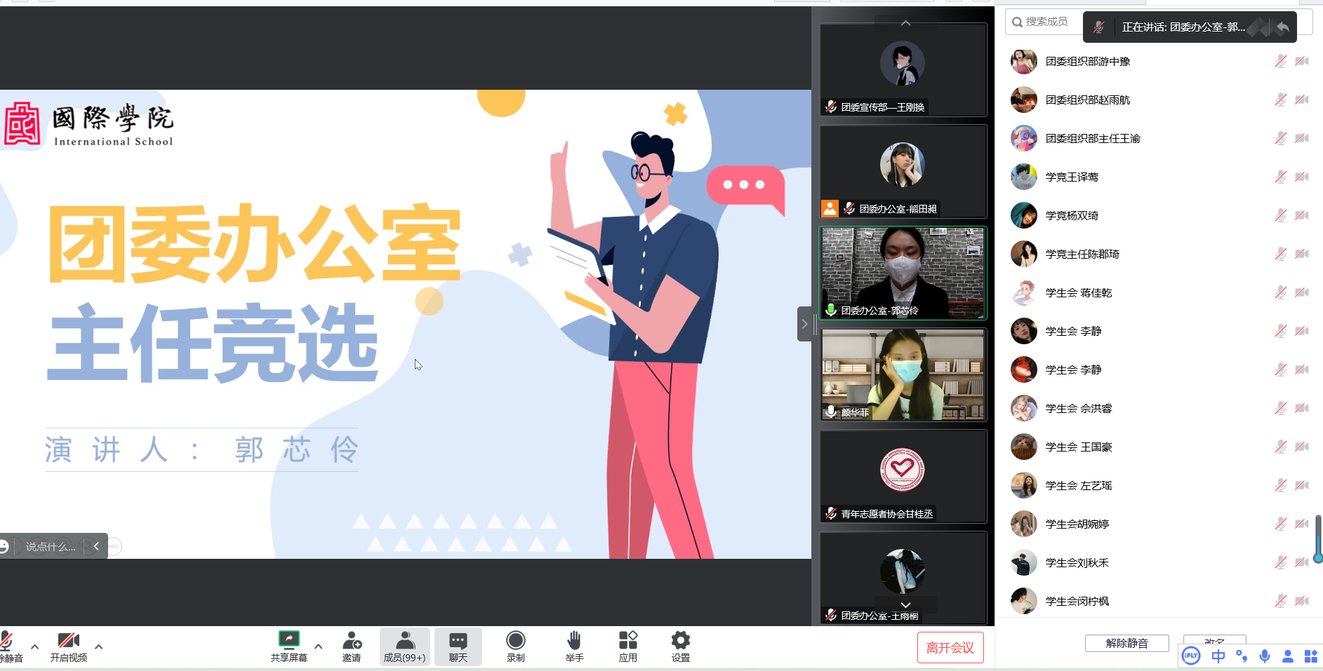 开展团委学生组织换届大会。根据疫情防控要求,本次换届大会以线上的形式开展。学院团委老师颜华菲、董宇婧、李雨霏、郑君花,学院团委各部门主任及各部门部长、部员参加。