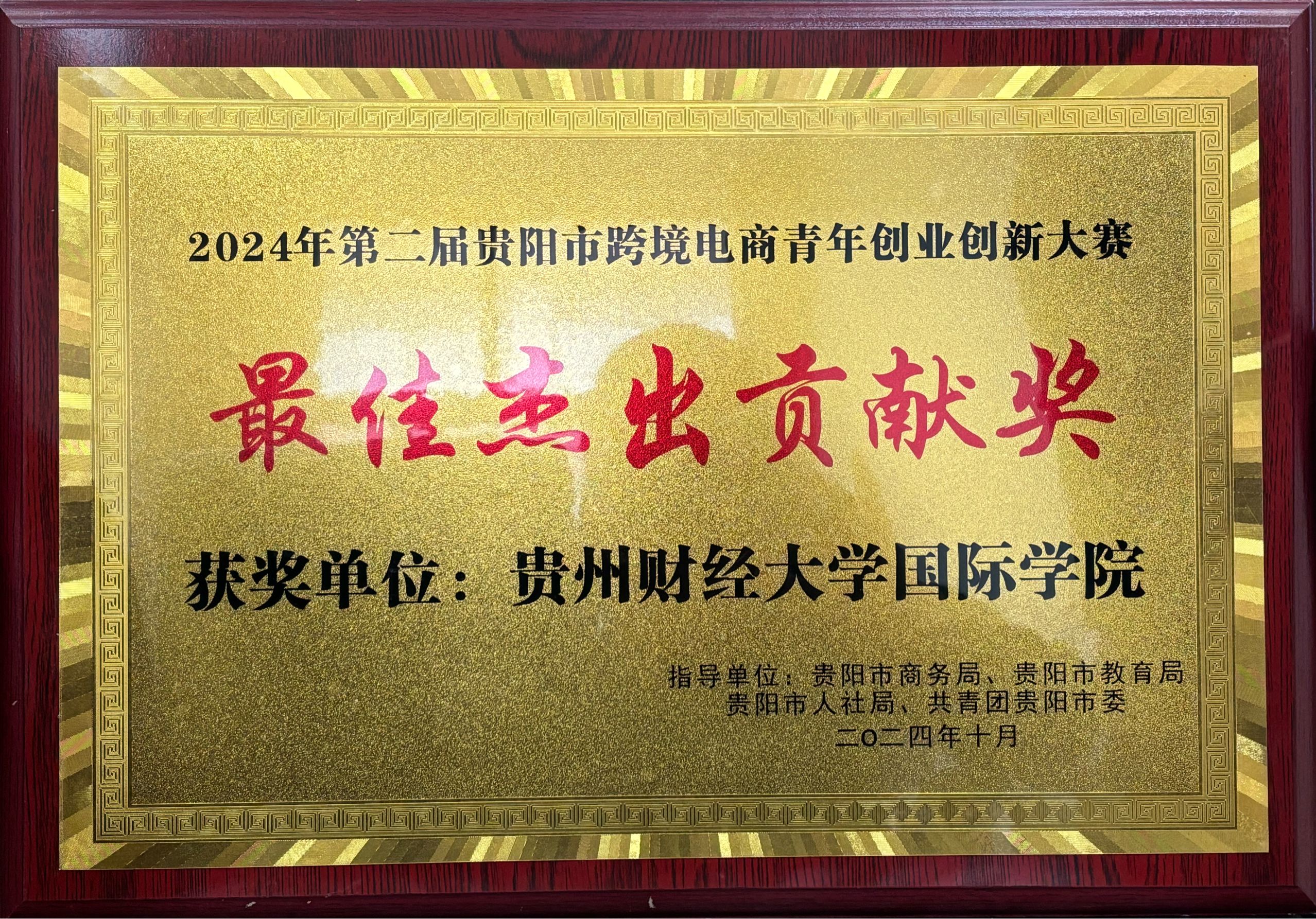 总决赛以路演方式举行,参赛队伍分别从大赛组委会提供的贵州产品库中选出一个适合产品,为其量身订制出海策略,进行讲解展示并通过评委问答环节。评委对各队伍的路演情况进行综合打分后,大赛组委会再根据打分情况以及综合实操运营环节的得分,评出对应奖项。 经过激烈角逐,我院的叶小燕团队获得“最佳视觉观奖”,张馨团队获得“最佳流量官奖”,王纯熙获得“最佳效率力奖”,陈星亦获得“初赛优秀奖”。我院也在此次大赛中获得“2024年第二届贵阳市跨境电商青年创业创新大赛最佳杰出贡献奖”。