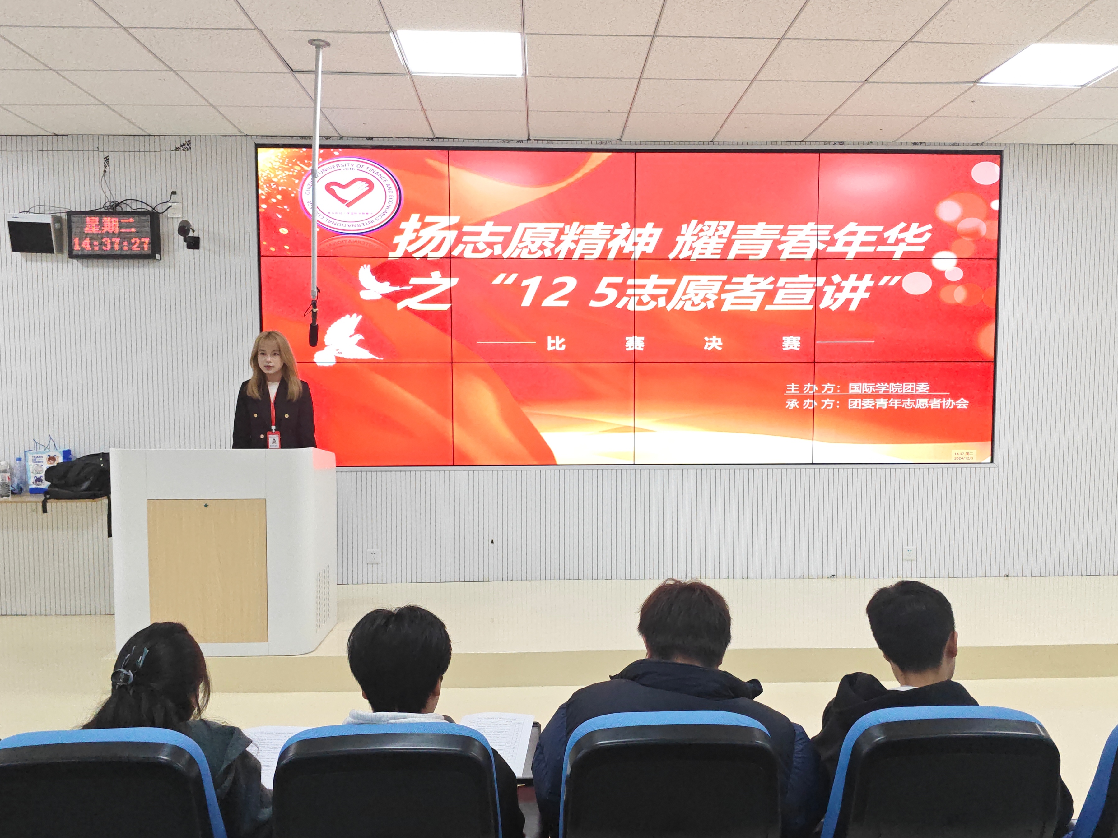 团委、青年志愿者协会在乐学楼102教室举办“扬志愿精神,耀青春年华”之“12·5 志愿者宣讲”比赛。