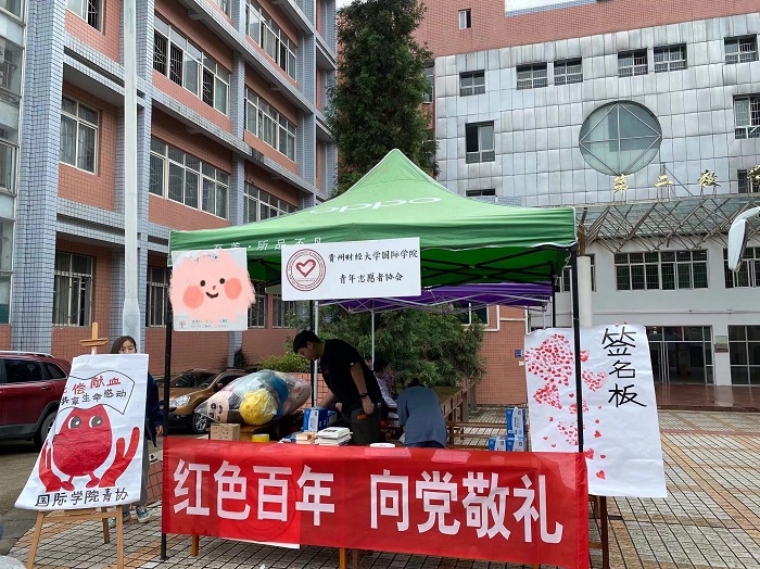 潘龙涛 报道|摄影 刘欢)为迎接党的百年华诞,弘扬无私奉献的精神,5月31日至6月4日,学院青年志愿者协会联合贵州省血液中心在鹿冲关校区第二教学楼门口开展“红色百年,向党敬礼”无偿献血活动,传递社会正能量,展示贵财学子风采。