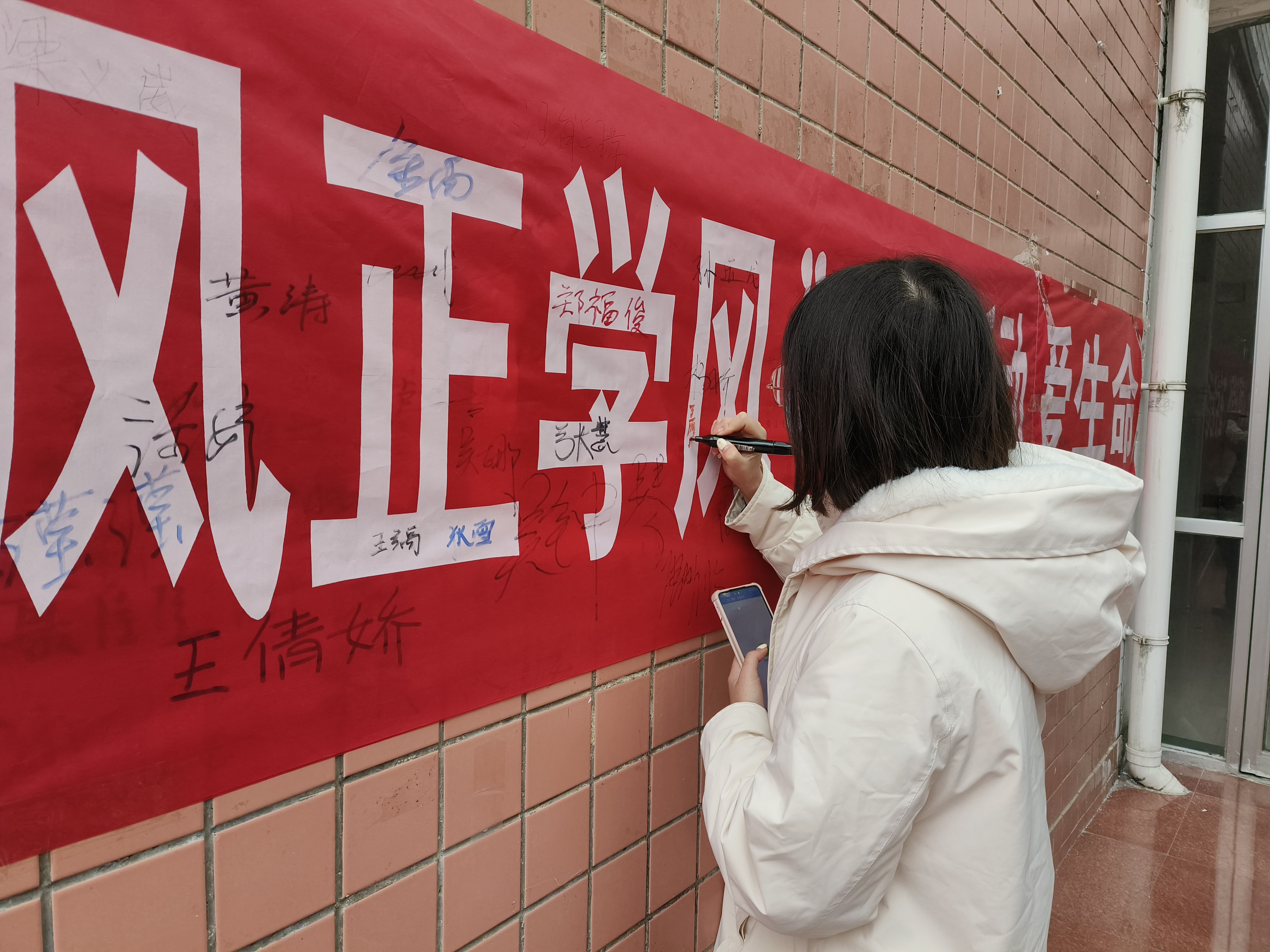 活动现场,在工作人员的组织下,同学们在了解到诚信考试的重要事项以及违反考试纪律的后果后,拿起签字笔,在“弘扬诚信之风,以考风正学风”的横幅上郑重地签上自己的名字,表示将自觉抵制作弊行为,以诚信考试为荣,以违纪违规作弊为耻,树立诚信之风,争做诚信的大学生。