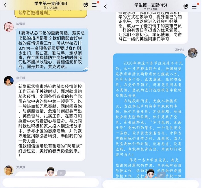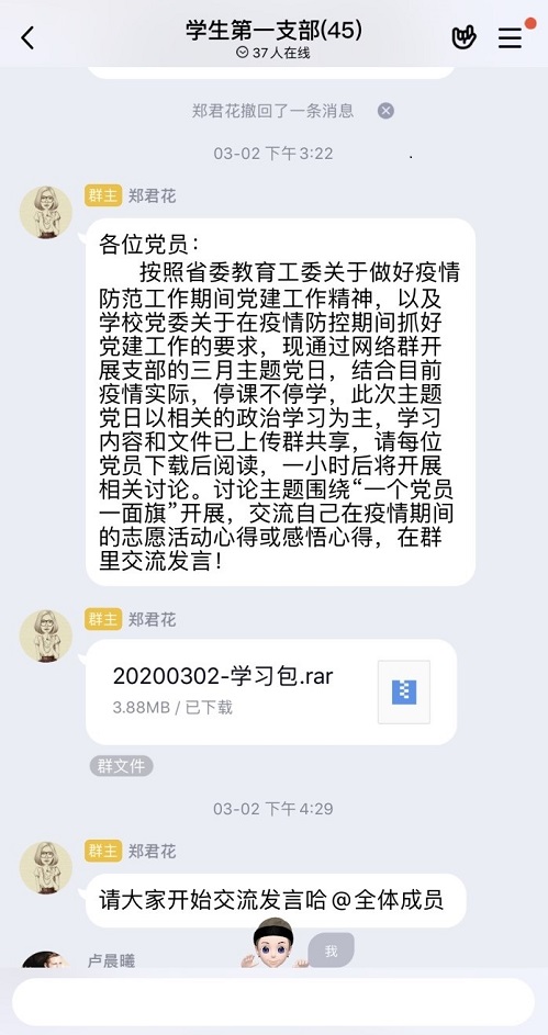 (无码漫画 郑君花 图文报道)为加强支部教师及学生党员在特殊事情对党理论知识的学习和对疫情局势的把控,无码漫画 学生第一党支部于3月2日召开第一次网络支部大会,支部党员应到45人,有两位海外党员因时差关系,故实到43人。