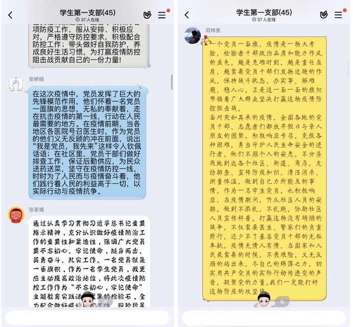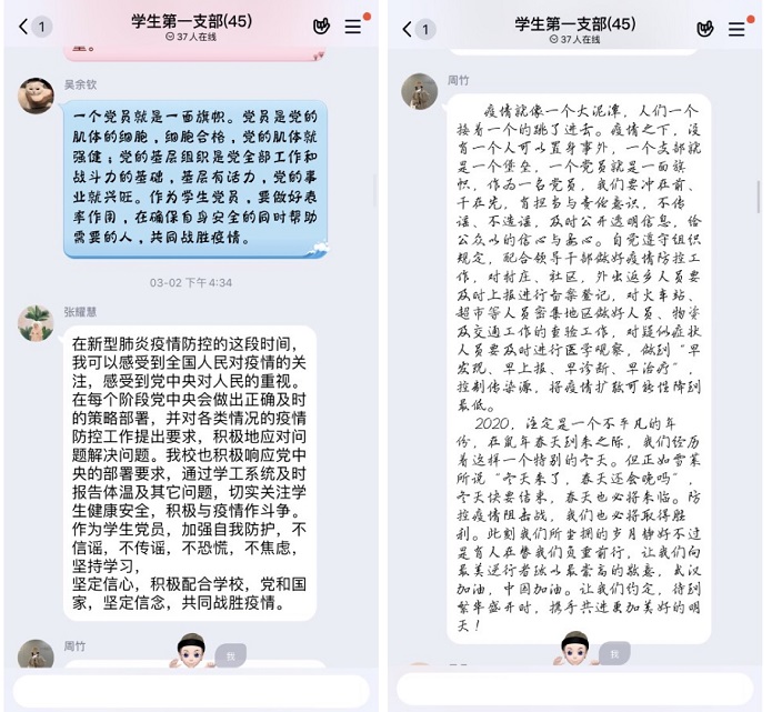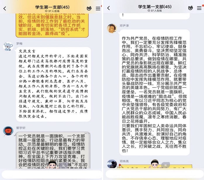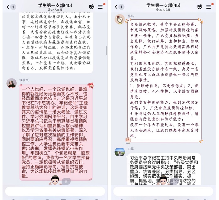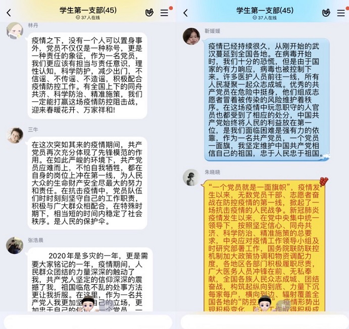 我支部认真贯彻落实疫情防范工作期间党建工作精神,并结合疫情实际,以“一个党员一面旗”为主题展开交流,各学生党员积极参与讨论,发表自己的看法。