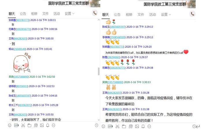 王瑛对全体党员认真学习和落实学校对疫情防控工作的各项安排工作表示肯定,同时强调高校作为人员密集的场所,同时也是防控疫情的前沿阵地,时刻按照习近平总书记的狠抓落实、增强忧患意识、提高工作本领三点要求,履职尽责,认真做好辅导员、党员、学生的思想政治工作,积极配合各职能部门做好疫情防控的各项工作。同时希望党员同志们,能结合自己的实际工作,为这场疫情战疫的最终胜利,作出自己应有的贡献!