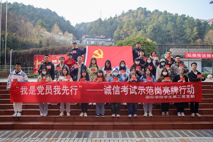 学生第二党支部开展“诚信考试,党员先行”诚信考试示范岗亮牌行动,要求支部全体党员在本学期期末考试中全部亮出“党员示范”岗牌子。支部书记董宇婧和支部全体党员参加了启动仪式。