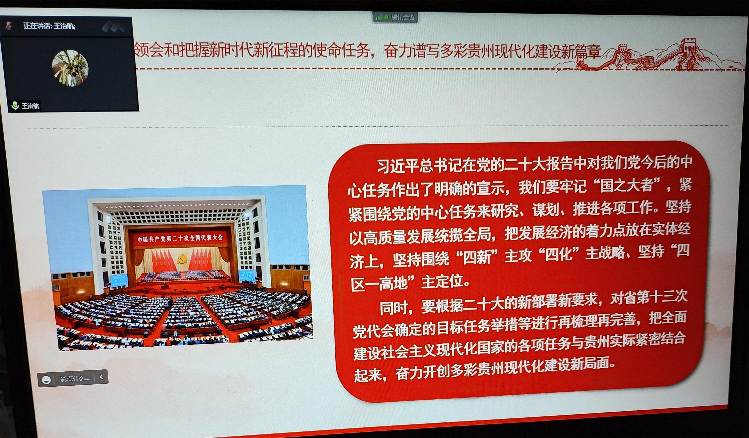 宣讲会上,王治航围绕深刻理解深刻领会和把握党的二十大的重大意义和重大主题、五年工作和新时代十年伟大变革、习近平新时代中国特色社会主义思想的世界观和方法论、以中国式现代化推进中华民族伟大复兴的使命任务、新时代新征程的使命任务和奋力谱写多彩贵州现代化建设新篇章等内容,全面系统解读党的二十大精神。