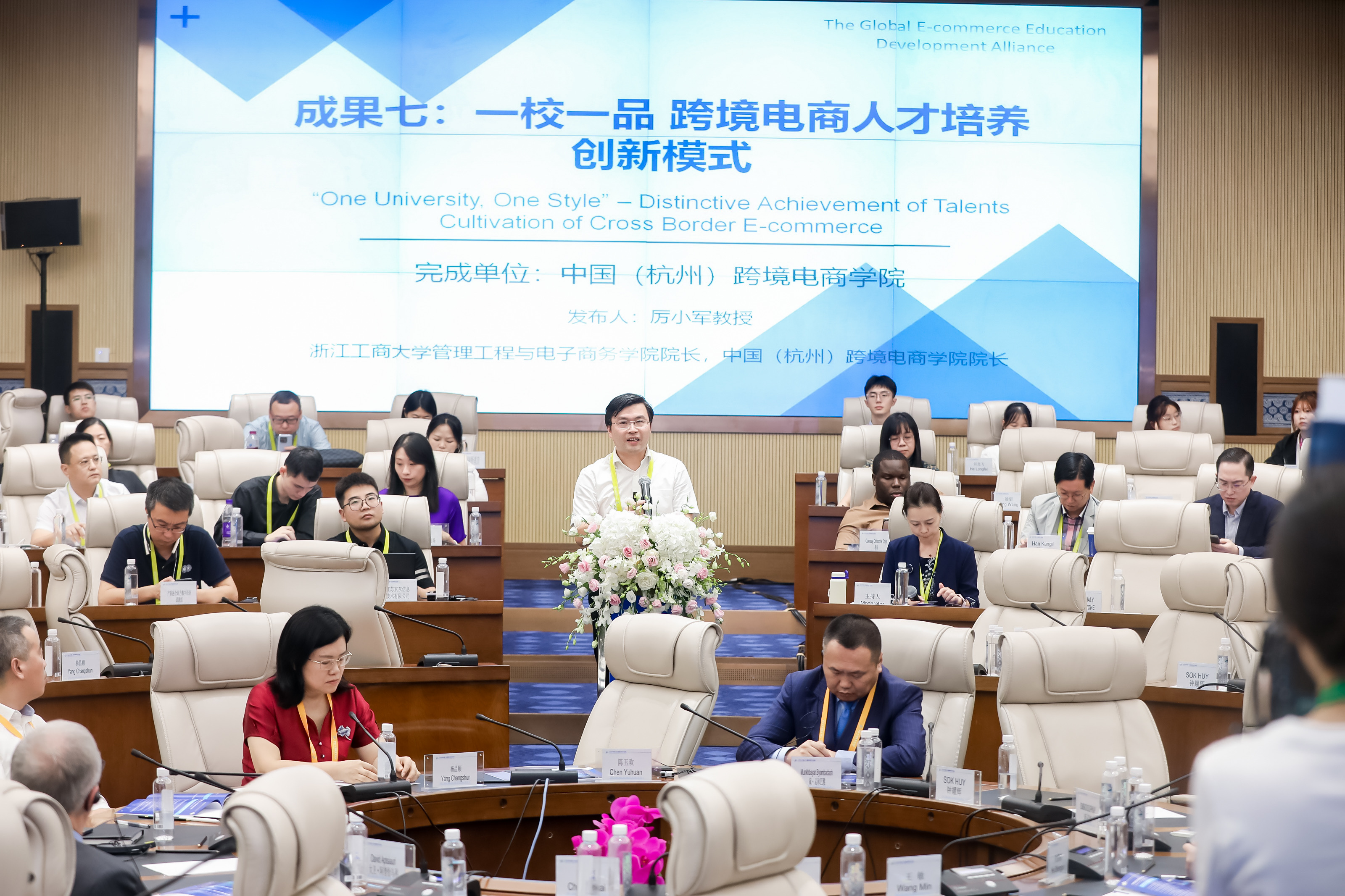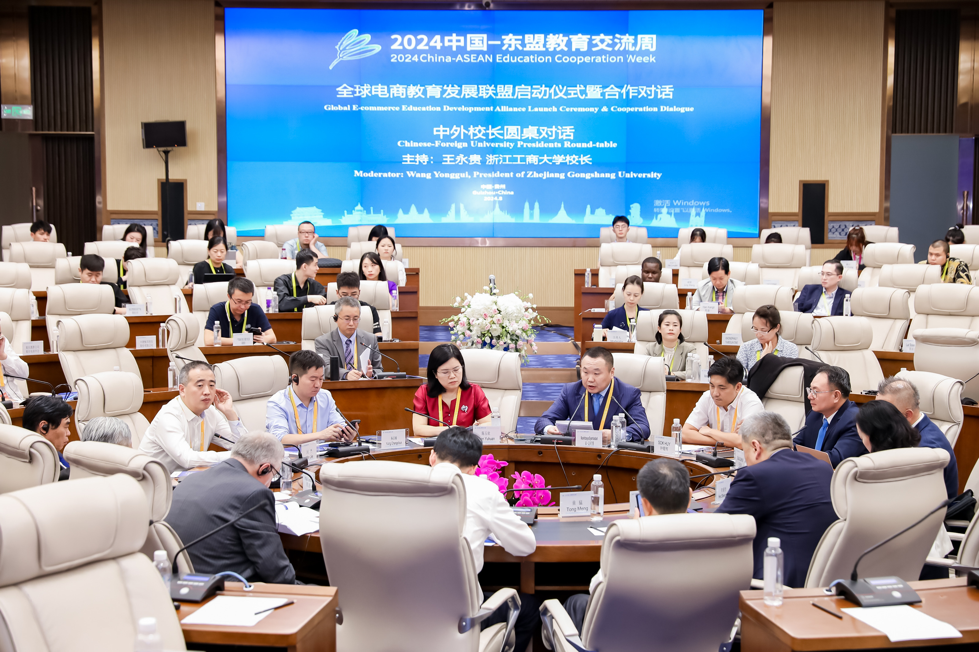 会上的中外校长圆桌对话,邀请了14名中外校长及专家围绕跨境电商、数字贸易、数字经济作主旨发言。圆桌对话由浙江工商大学校长王永贵主持。云南财经大学校长王敏、武汉轻工大学董仕节、老挝乌多姆赛省教育厅厅长宋萨、马来西亚拉曼大学校长尤芳达、柬埔寨柬华应用科技大学执行校长钟耀辉、蒙古财经大学校长斌·孟和巴雅尔、泰国正大管理学院助理校长、中国东盟研究中心(CASPIM)主任汤之敏、格鲁吉亚工商会会长大卫·阿普恰乌利等中外嘉宾参加了圆桌对话。中外教育领袖围绕电商教育的新趋势、新模式展开深入交流。