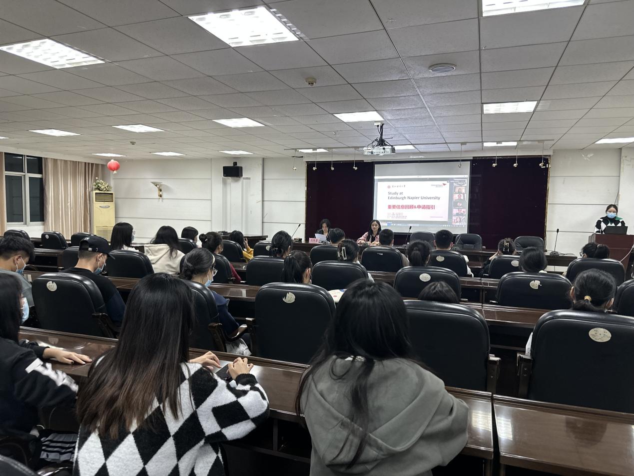 副院长刘利音出席动员会。主讲嘉宾为英国爱丁堡龙比亚大学亚太区国际合作招生主任周帆、龙比亚大学中国区招生主任廖嘉欣和中国区高级项目招生专员张江龙。来自该项目2019级、2020级的160多名学生代表参加,会议由项目科老师卫荷主持。