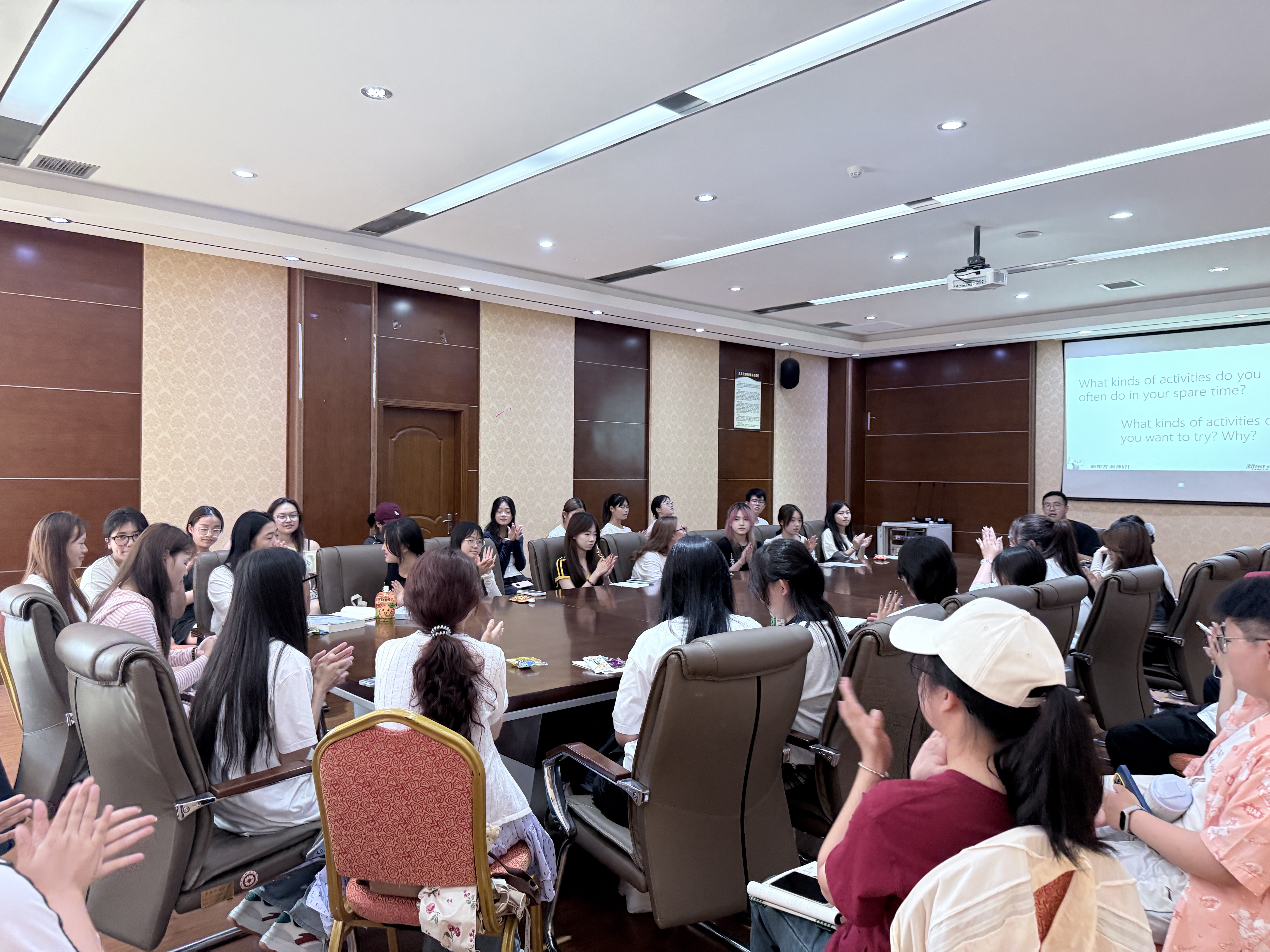 活动中,新东方国际教育老师张宇瀚分享了自己多年的英语学习经验与教学心得,并鼓励大家勇敢开口、主动表达,不怕犯错。张宇瀚的真诚态度与热情感染了在场每一位同学,为整场活动奠定了轻松愉悦的交流基调。在互动交流环节,张宇瀚凭借丰富的教学经验,以各种表情包搭配为切入点,带领同学们开启一场emoji(颜文字)猜英语单词的游戏。通过一个个可爱的表情包和出乎意料的单词搭配,在场的同学们都跃跃欲试,完成了一个又一个的猜词游戏,活动现场的气氛也瞬间被点燃。在以“个人日常活动”为主题的讨论环节,张宇瀚引导同学们围绕“每日作息、休闲爱好、时间管理”展开讨论,重点引导大家运用“always”“often”“sometimes”等频率副词与一般现在时进行表达。现场互动中,同学们在轻松自然的对话中不仅加深了对语法知识的理解,也更自信地开口使用英语表达。