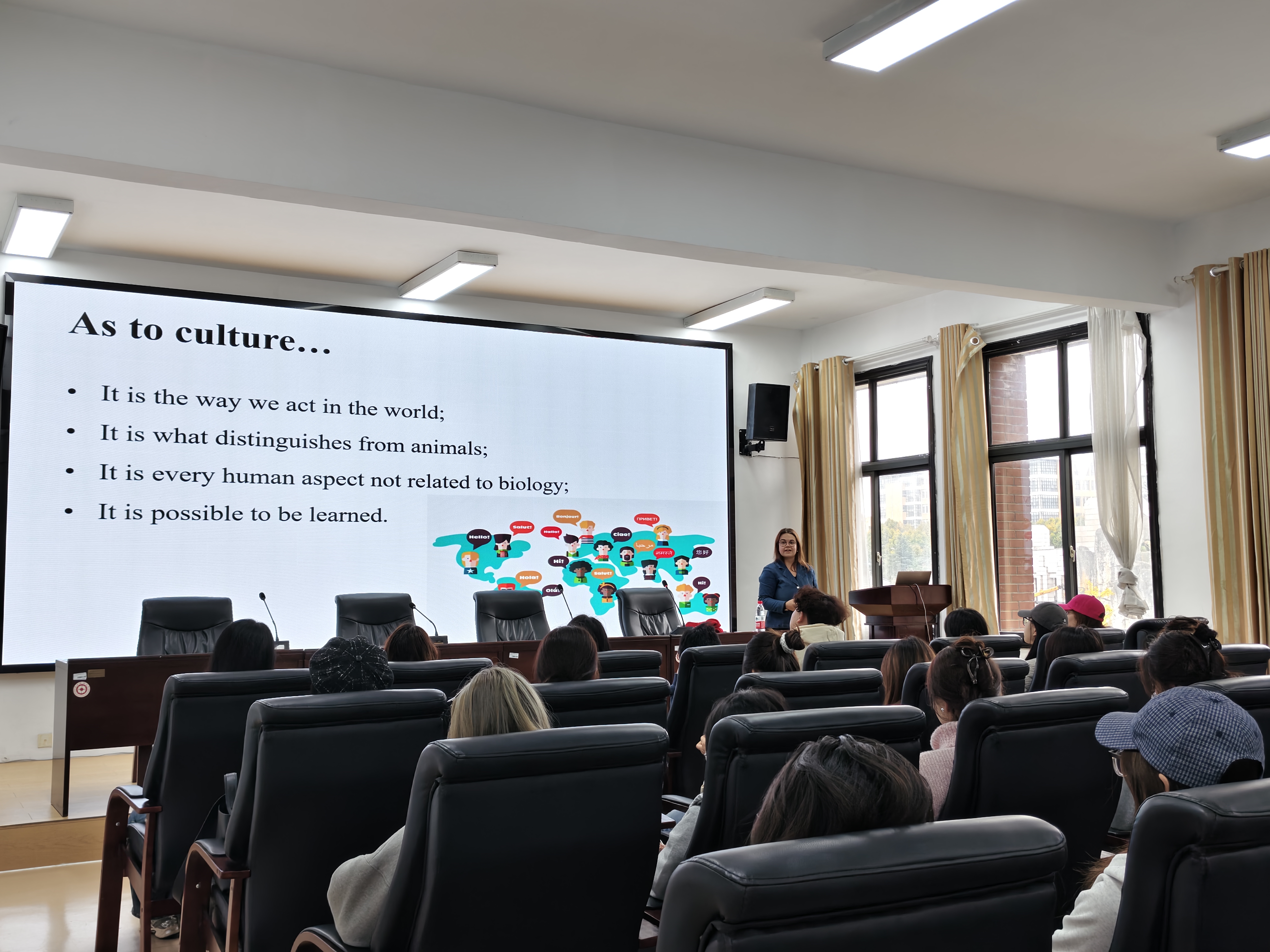 Caroline Navarrina以一系列贴近生活的问题开场,迅速引发了学生的浓厚兴趣与热烈讨论。她指出,学习一门语言,远非仅仅掌握词汇和语法系统,更是要理解其背后丰富的超语言因素,包括非语言沟通、行为信号、历史语境和副语言等。Caroline Navarrina援引了Albert Mehrabian的经典模型,揭示了沟通中高达93%的信息通过语调、表情、姿态等非语言渠道传递,生动阐释了“如何说”比“说什么”有时更为关键。此外,她还通过英语、葡萄牙语、法语及中文在表达数字、颜色、时间乃至性别概念上的具体差异,深刻论证了“语言如何塑造思维”,并强调了历史地理对文化与语言的深远影响。